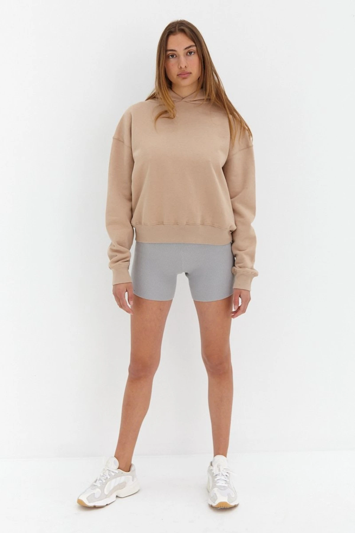 Stay cosy in the Studio Hoodie. Worn here with the Knit Shorts in Grey.